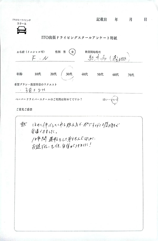 最終的にはマイカーで高速道路の運転に挑戦して頂きましたね。駐車場でのバックについてもマイカーについているバックモニターを利用し、安定して駐車ができるようになっていただき。教えている私も嬉しくなりました。