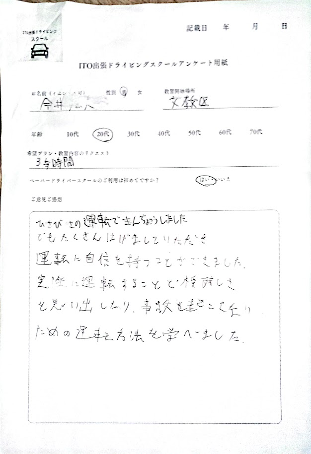 東京23区文京区(目白駅付近) 男性I様 東京都内の運転が未経験のため教習を受けました。