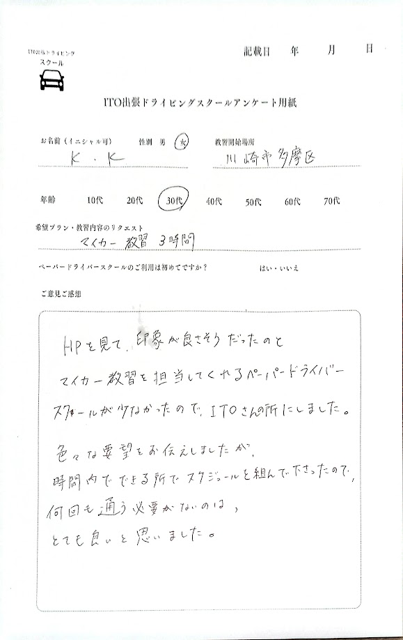 HPを見て印象が良さそうだったのと、マイカー教習を担当してくれるペーパードライバースクールが少なかったためITO出張ドライビングスクールさんのところにお願いしました。色々な要望をお伝えしましたが時間内でできるところでスケジュールを組んでくださったので、何回も通う必要がないのがとても良いと思いました。