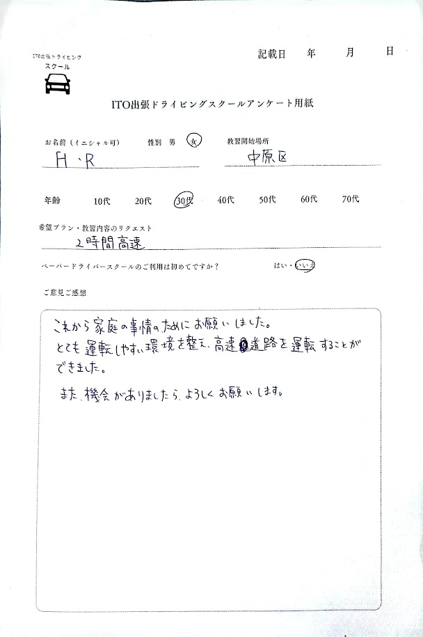 家庭の事情で運転をしなければならない状況になりました。とても運転しやすい環境を整えていただき高速道路を運転することができました!