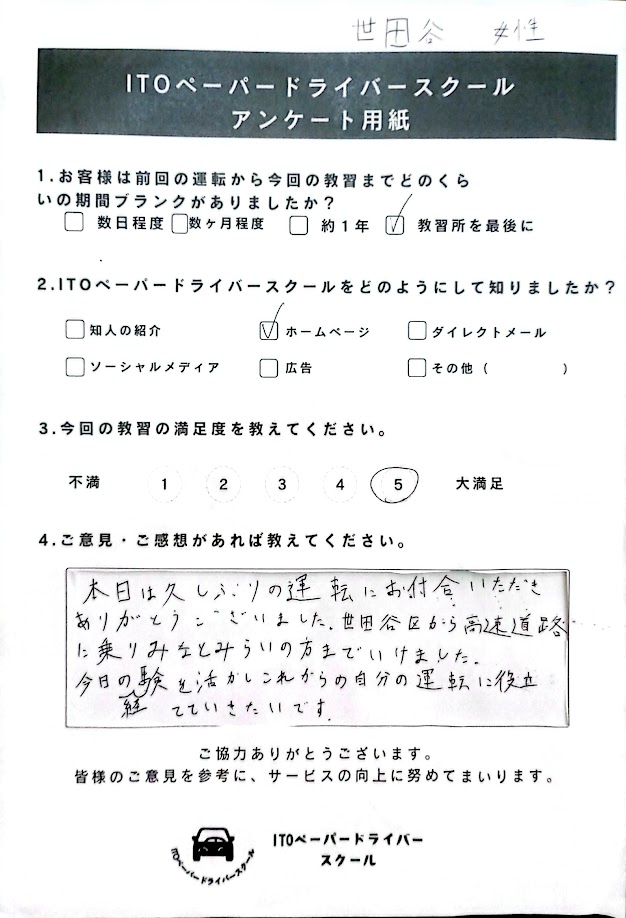 本日は久しぶりの運転にお付合いただきありがとうございました。世田谷区から高速道路に乗りみなとみらいの方までいけました。今日のを経験を活かしこれからの自分の運転に役立てていきたいです!